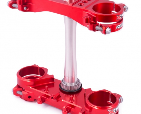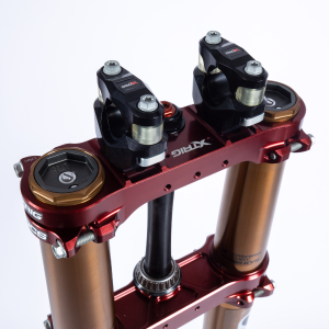 X TRIG has created a new system for an even higher stability of the already top-quality triple clamps. Opposing clamps guarantee an even better functioning of the fork and are more stable than ever. Split clamps improve the bending line of the fork.